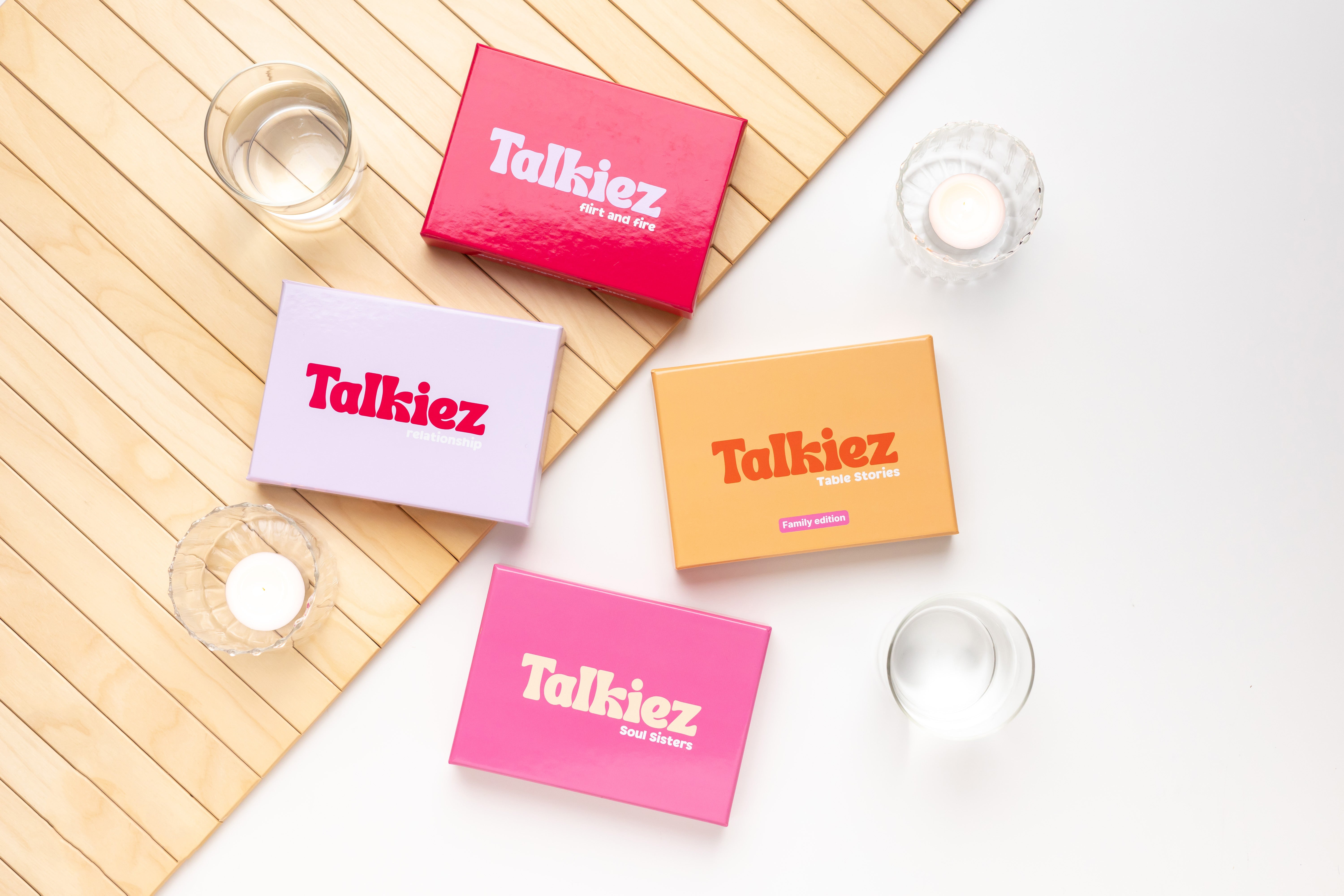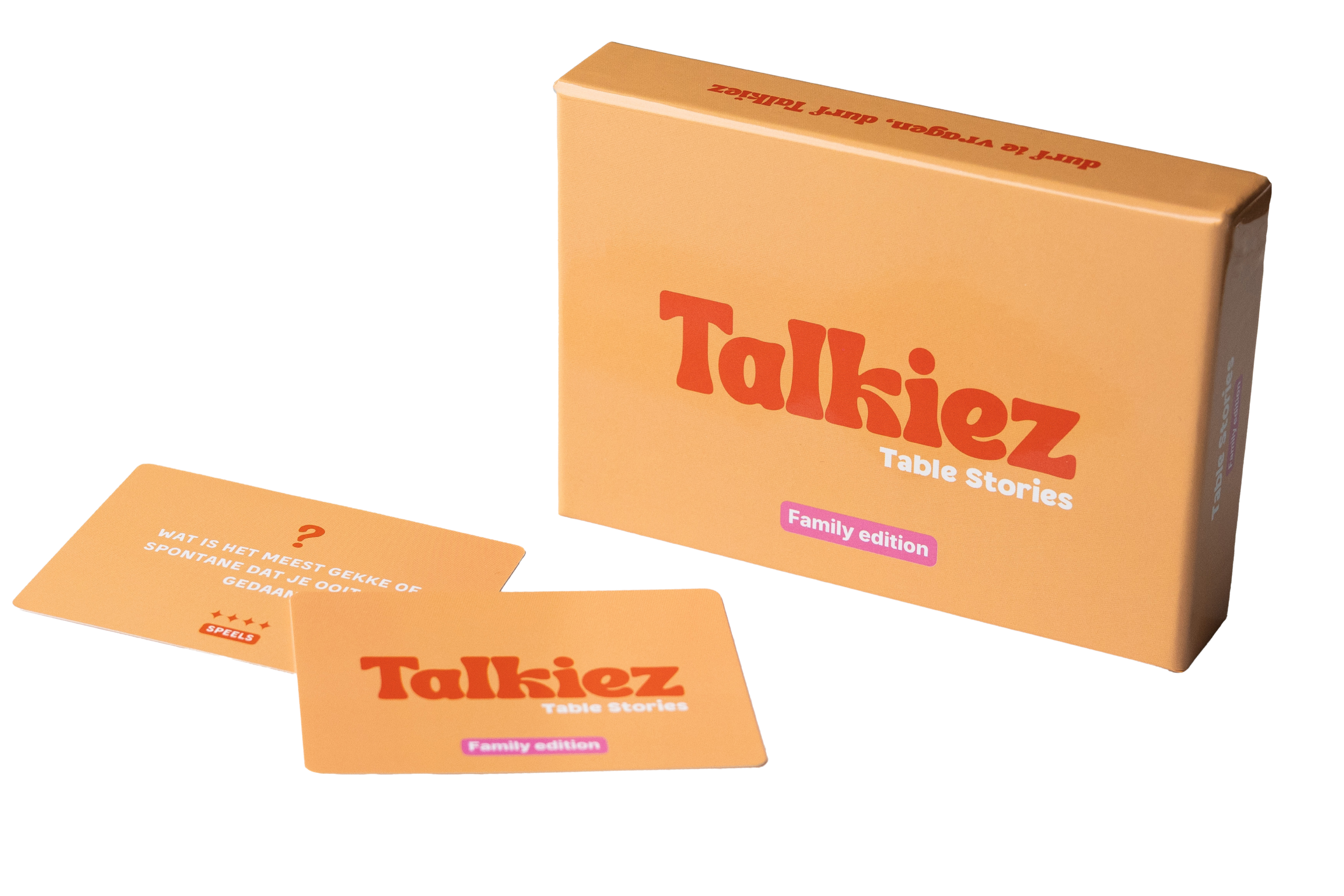 Talkiez Table Stories is het spel met vragen voor iedere family gathering en ieder moment. Of je nu speelt met je gezin, je ouders, je broer of zus, je neefjes en nichtjes of de hele familie met drie generaties tegelijk: de vragen helpen jullie om een diepere connectie aan te gaan en elkaar echt beter te leren kennen.