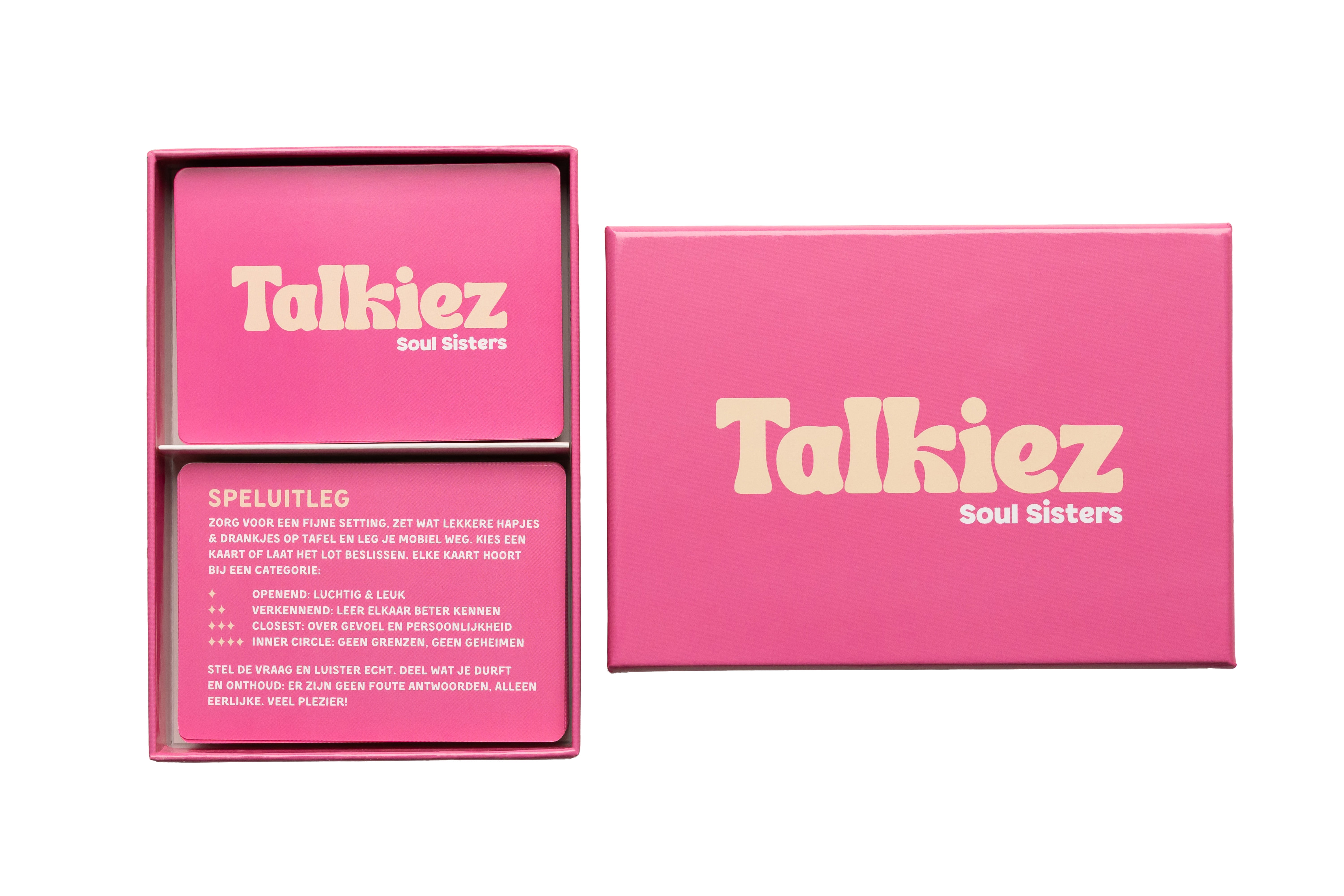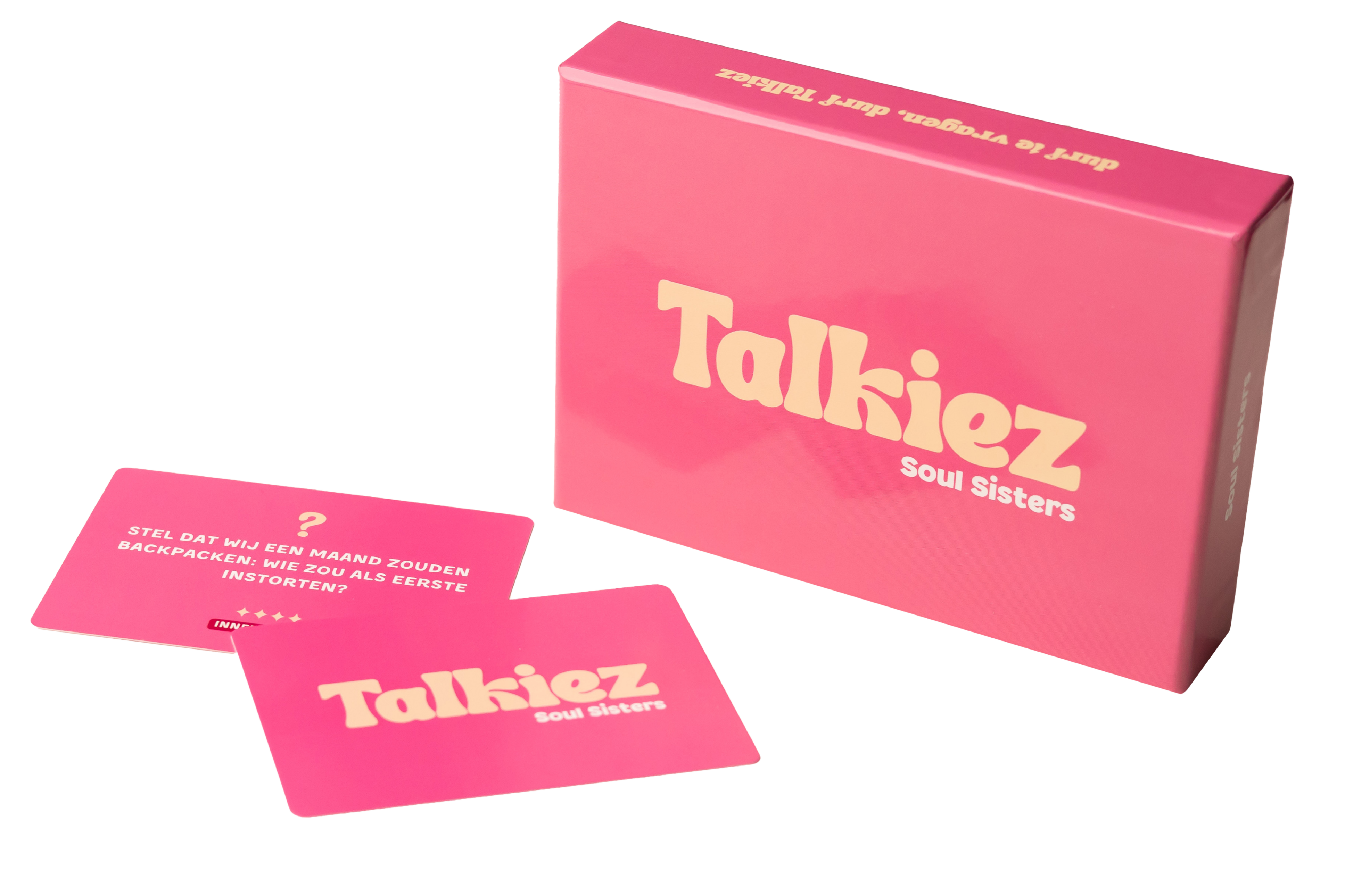 Talkiez Soul Sisters is het vragenspel voor vriendinnen dat zorgt voor diepe, hilarische en onverwachte gesprekken. Ideaal voor een slaapfeestje, wijnavondje, roadtrip, weekendje weg of jullie vaste meidenavond. De vragen lopen uiteen van luchtig fun tot echt betekenisvolle gesprekken, waardoor jullie elkaar op een warme en speelse manier nog beter leren kennen.